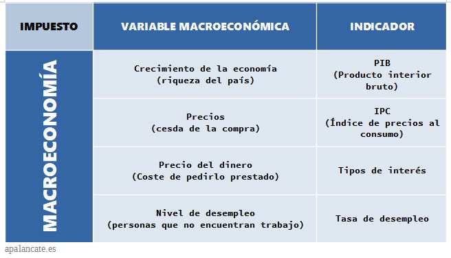 Crecimiento económico: es la variable más importante y posiblemente, la más usada en economía. El mayor o menor crecimiento de un país, repercute en todos los aspectos económicos del país: empleo, precios, etc. Se mide mediante el PIB.