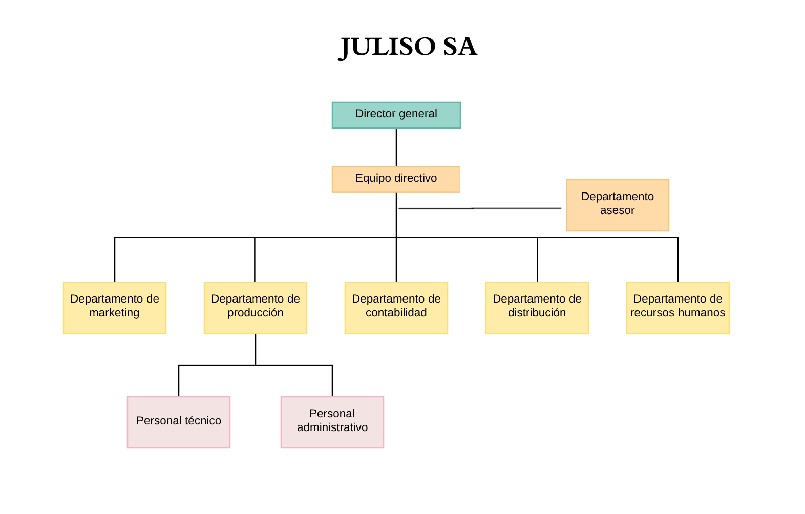 Parte 3: la empresa “Parásito” S.L se dedica a la producción de equipos informáticos. Su organigrama consta de las siguientes características: al mando de la empresa está el director general, asesorado por un gabinete jurídico. Dicho director está por encima de los directores de los varios departamentos, que son: