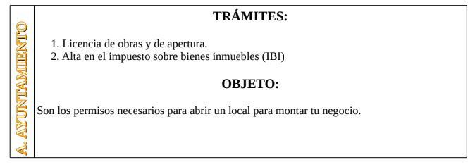 Diferentes son los trámites necesarios para iniciar la actividad: si se van a contratar o no trabajadores, obras en el local, etc. En este caso te hemos puesto varios botones donde podrás ver dónde se hace y qué trámites son necesarios en cada una de los organismos que se indican. ¡Clica sobre ellos!.