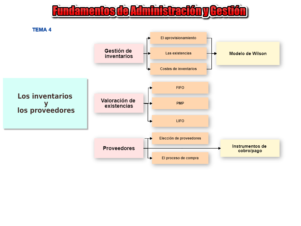 El tema 4 es un tema complejo en el que se trata de cómo las empresas gestionan sus inventarios así como el coste que estos tienen. También verás los 3 métodos más conocidos que hay en cuanto a la valoración de las existencias. A continuación verás los proveedores y la importancia que estos tienen en la empresa. Finalizaremos con los métodos que hay de cobro y pago en el mundo de la empresa...y en el tuyo.