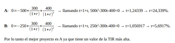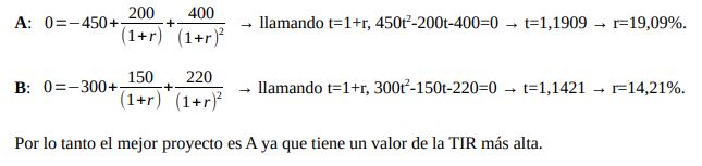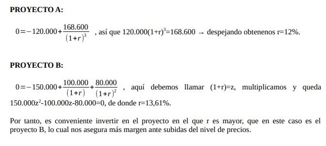 La empresa Café & Leche, SA, quiere hacer una inversión y necesita valorar la mejor opción entre dos proyectos. Qué proyecto seleccionará aplicando el criterio de la tasa de rendimiento interno (TIR)? (En unidades monetarias.) Razona la respuesta
